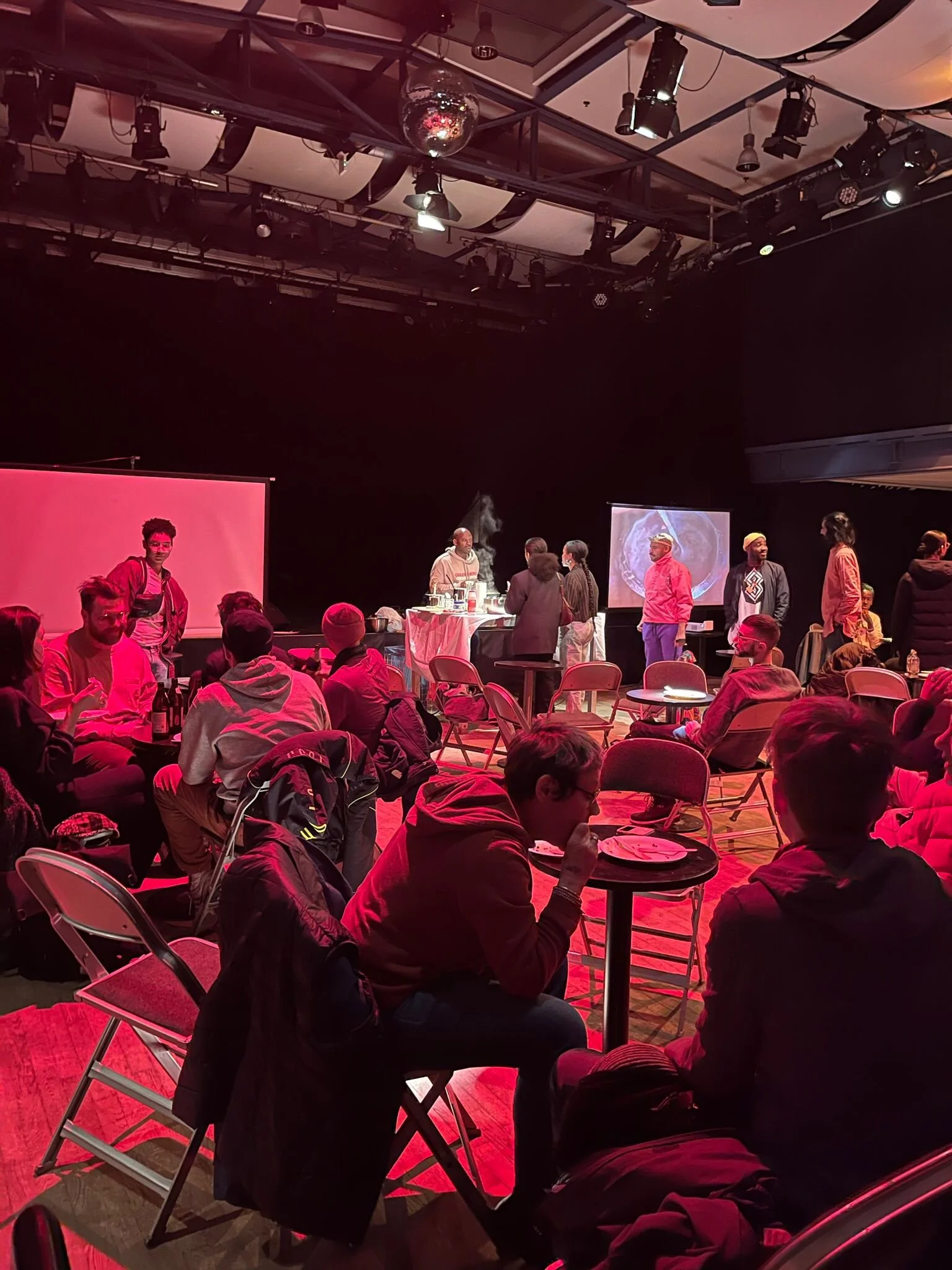 Audience gathers for a live communal dining and storytelling performance in a dimly lit theatre space.  Red stage lighting casts a warm glow over diverse attendees seated at tables eating and conversing. Projection screens create an immersive environ