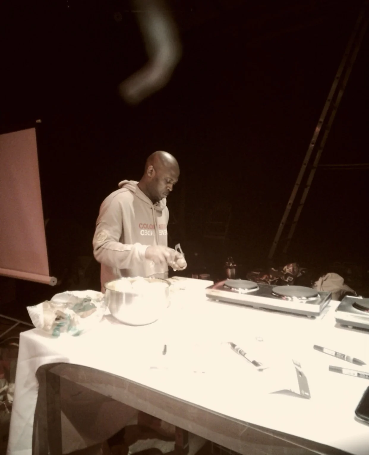 Artist prepares food as part of a live performance installation exploring diaspora, memory and ritual. The dimly lit stage evokes and intimate process-driven atmosphere blending culinary gesture with political commentary and storytelling.