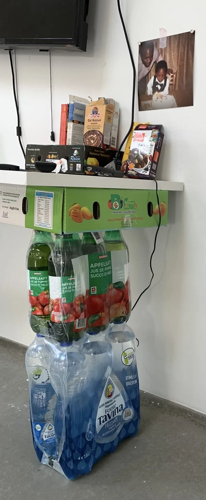 Materials: Bottled water, mango boxes, family photos, iPhone