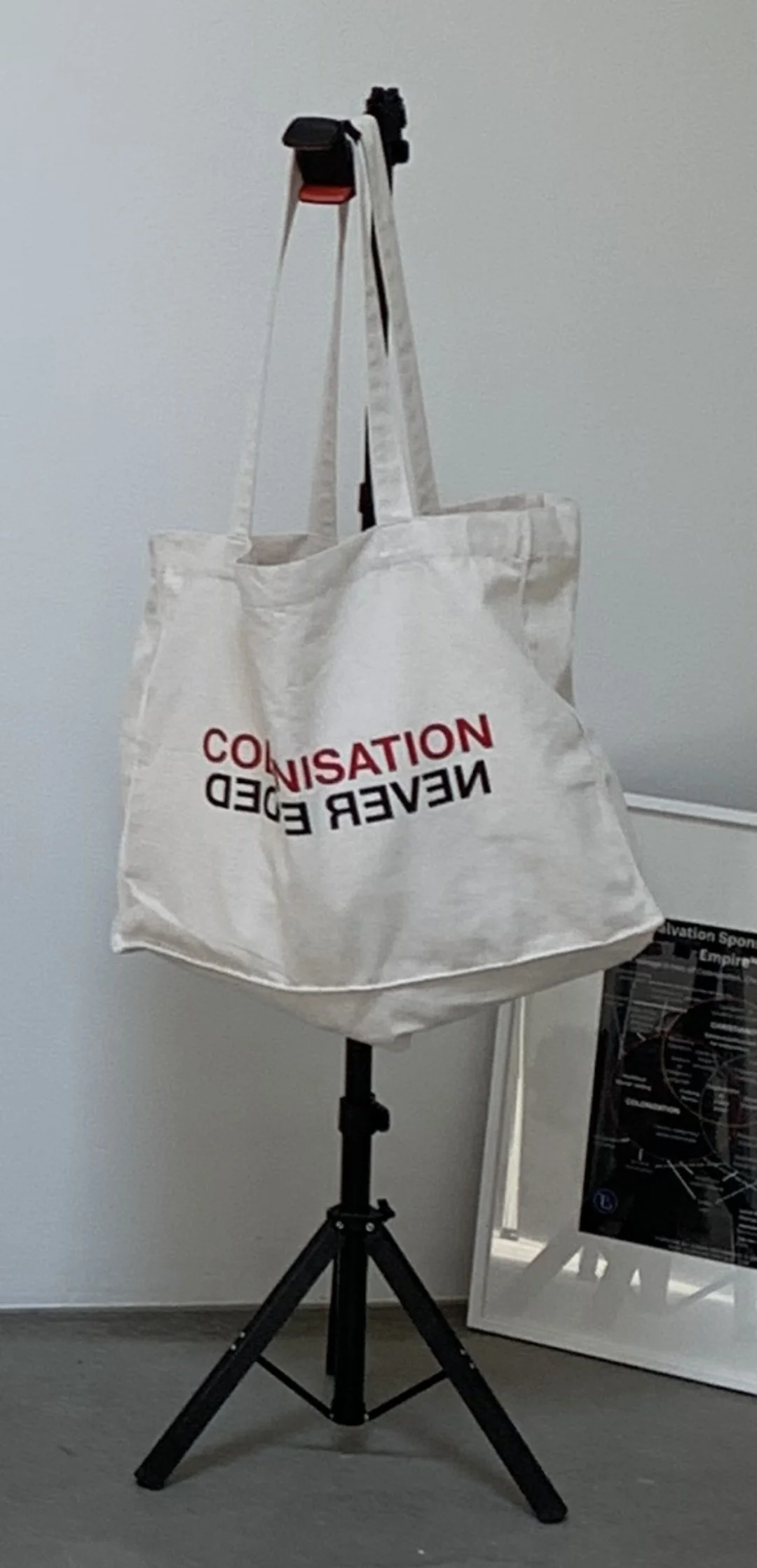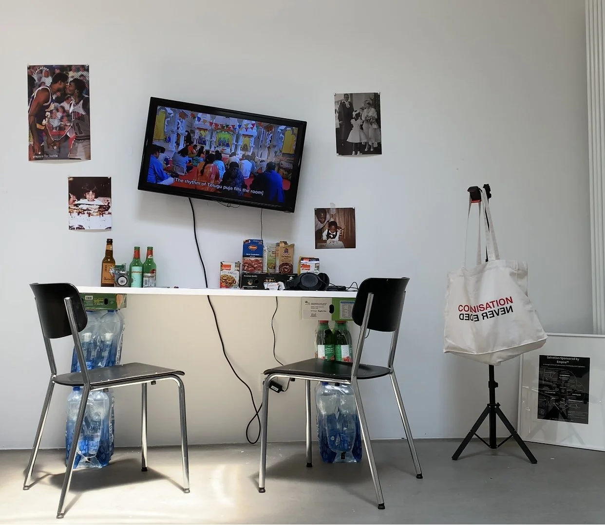 The installation foregrounds diasporic domesticity as architecture — built from what is available, temporary, and globally sourced.
